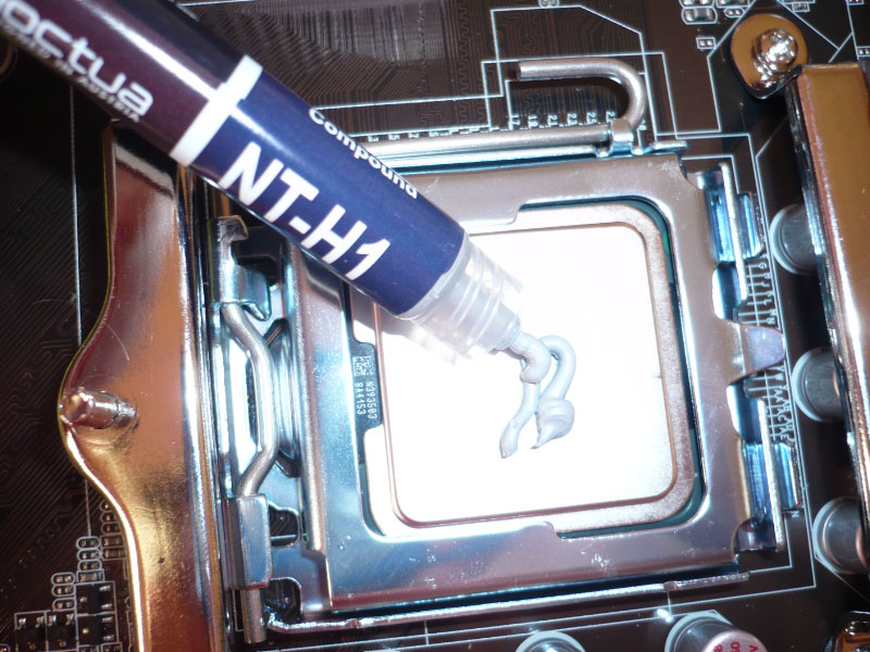 Beigelegte Wärmeleitpaste auftragen und mit dem Stück einer Kreditkarte verstreichen. Nen Tip von mir : Kühler mal kurz andrücken und schauen ob sich die Leitpaste gleichmäßig verteilt.